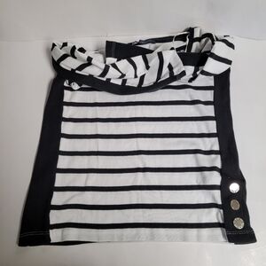 Tommy Hilfiger black and crisp white striped long sleeve top with a stretchy ribbed lining on the sides and inner arms as well as on the neckline. 3 gold snap buttons on one side with Hilfiger stamped on them