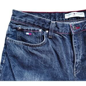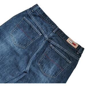 Traditional 5-pocket jeans with iconic Tommy red stitching around waist and pockets