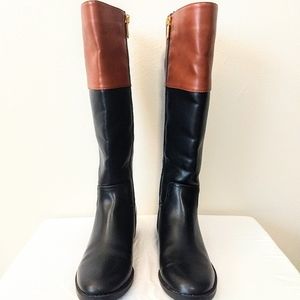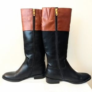 Beautiful black and brown riding boots with gold accent logo and zipper. Insides are clean, with a silky purple lining. Bottoms have like-new tread with very little wear. Made by Tommy Hilfiger, made of all man-made materials.