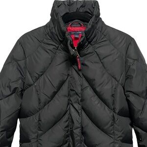 Tommy Hilfiger Black Down Feather Puffer Coat. Red lining. Front zip with button closure. High collar. Tommy Hilfiger patch on the side of the arm.
