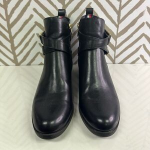 Tommy Hilfiger Black Faux Leather Gold Logo Boots Size 9