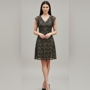 Tommy Hilfiger gold floral mesh lace fit and flare dress with flutter sleeves.