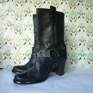 Tommy Hilfiger Motorcycle Boot - This boot is nice, soft, black leather with a strap around the ankle and a Tommy ring and rivets. Very Rock n' Roll. Boot doesn't have a zipper. it is a simple pull on style with little straps to grab on to. Sole is nice and thick and won't wear out easily. These have been worn twice. Very good shape! Classic Style.