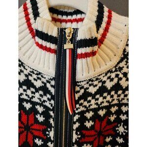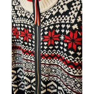 Stylish cardigan with intricate patterns. Features a zip-up front. Perfect for layering.