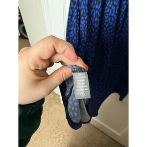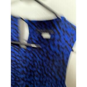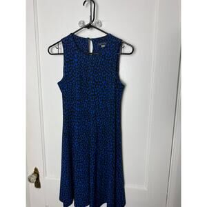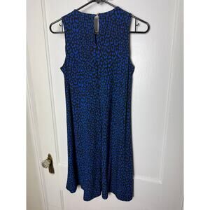 Excellent condition - no snags, holes, or stains. Blue dress with black animal print allover. Sleeveless style. Button at the back of the neck. Stretchy. Swing trapeze style. Smoke free pet friendly home. All offers are welcome.