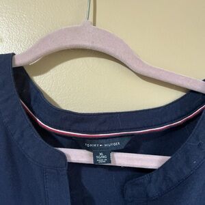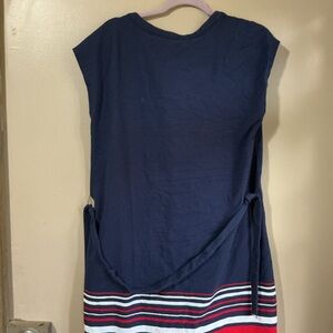 This relaxed mini dress from Tommy Hilfiger features a striking blue color with a V-neckline and a stylish tie front. The tunic's boxy fit and lightweight fabric make it perfect for casual wear, while the red and white striped accents add a touch of nautical flair. Size XL