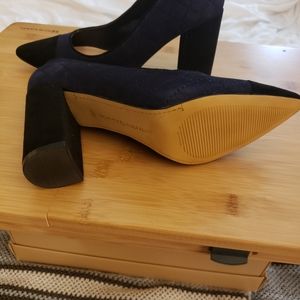 New, Tommy Hilfiger two tone blue pump with 3 inch stacked heel. Size 6M. Criss cross pattern on medium blue body with darker blue toe and heel.