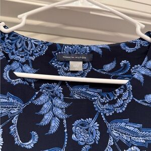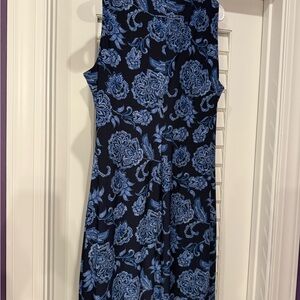 Tommy Hilfiger Blue Sheath Midi Dress with a mock neck, size 10. This stunning blue sheath midi dress by Tommy Hilfiger features a mock neck and a sleeveless design and lightweight fabric, perfect for a summer dinner. The dress showcases a beautiful floral pattern that elegantly contrasts against the structured fabric, ensuring a sophisticated and stylish appearance. Excellent used condition, smoke free home