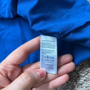 This Tommy Hilfiger tee features a vibrant blue hue and a classic crew neck design, perfect for casual wear. Made from high-quality cotton, it offers comfort and durability with a subtle embroidered logo on the chest for a touch of elegance. Some minor small pilling from gentle wear.