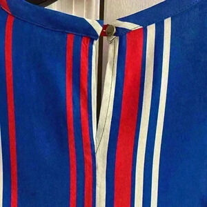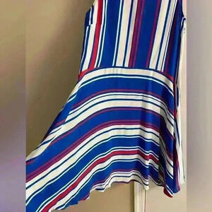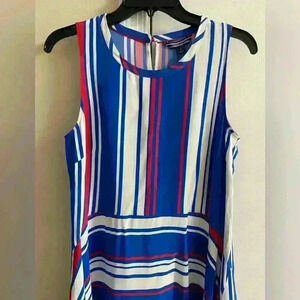 Stylish midi dress with bold blue, red, and white stripes. Sleeveless design. Perfect for casual outings.