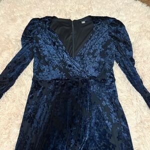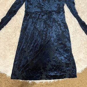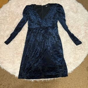 Chic velvet dress in a deep blue shade. Features a wrap design and long sleeves. Perfect for evening events.