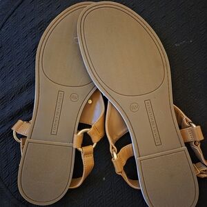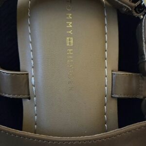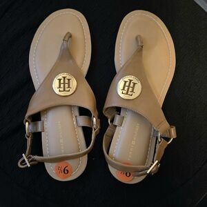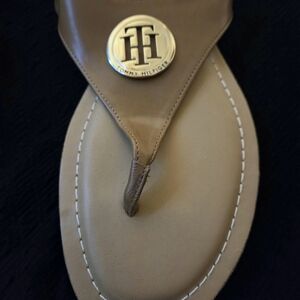 Stylish brown sandals featuring a gold Tommy Hilfiger logo. Perfect for casual wear.