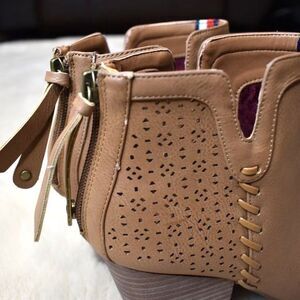 Step into timeless style with these Tommy Hilfiger ankle boots in women’s size 9.5. Featuring a low stacked heel, almond toe, and side zipper closure, these boots are perfect for pairing with jeans, dresses, or skirts. Crafted in a versatile light brown shade, they bring a touch of western-inspired flair to your look. Lightly used and in good condition with one small scuff at the top (see last photo).