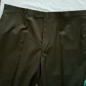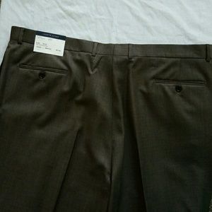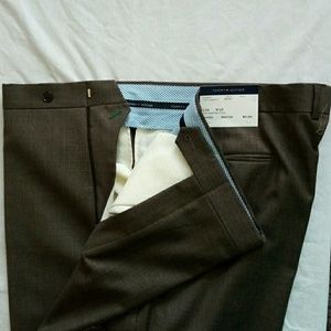 New with tags Tommy Hilfiger brown 2pcs Suit Size L50 W45. 100% worsted wool, classically tailored trim fit 4 cuff buttons 2 interior pockets 2 slit cut at the back 2 flop pockets 1 top pocket. Shoulder to Shoulder:21" Back collar to hem: 33" Pants: 2 front pockets 2 back pockets, zipper with enclosed snap and bottoms?. Rise: 12" Inseam is unfinished (38")
