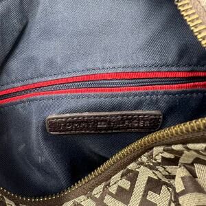 Roomy Tommy Hilfiger monogram print bag. Top zip with small zippered pocket on the back and deep pockets on either side. Strap has shiny gold chain details on either side. Inside is one more zippered pocket and a couple more open pockets.