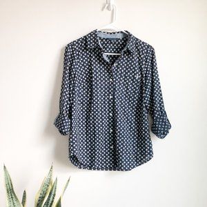 Professional and cut to fit, with a side of fun and flirty. Navy women's button down with dainty white flower pattern, with signature Tommy Hilfiger embroidered detail. Condition like new