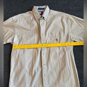 Tommy Hilfiger brand logo pocket button down shirt. Size medium in a beige/khaki color. Measurements in photos. Preowned very good condition with signs of normal wear. A few very smell stains as shown in photos. Have not tried to clean.