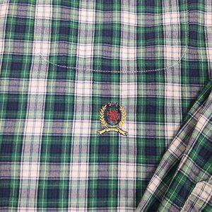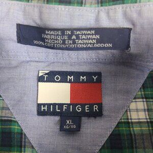 This Tommy Hilfiger Button Up Shirt is a classic and stylish choice for a casual occasion. The shirt comes in a size XL and features a collared neckline with a button-down style. It is designed with a green and white plaid pattern, long sleeves, and the iconic Tommy Hilfiger logo accent. Made of cotton fabric, this shirt is suitable for all seasons and can be easily cared for with machine washing. Perfect for a 90s-inspired look, this shirt offers a regular fit for a comfortable wear.