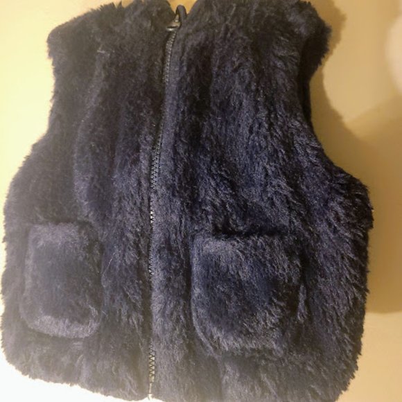 Adorable, pre-owned , warm fluffy vest with hood. Zip up with front pockets. Very stylish for a toddler out and about.