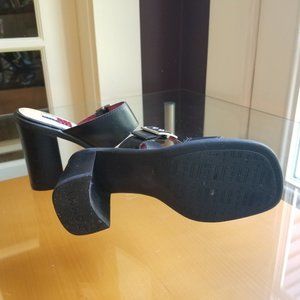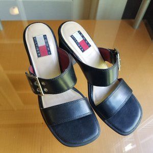 Cute pair of black Tommy Hilfiger chunky heel sandals in a size 6. Leather upper, rubber sole, adjustable straps, and wood stacked 3” heel. These are in great gently used condition. Made in Brazil.