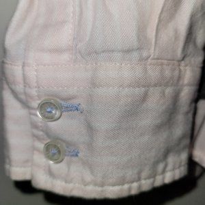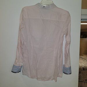 Pink/White stripe button down shirt with light blue contrast cuffs and button hole stitching. One minor stain on sleeve shown in photo. Size M.