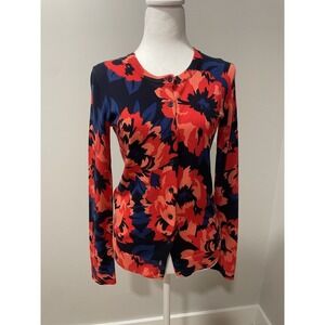 Excellent condition Tommy Hilfiger Cardigan with vivid artistic floral pattern. This sweater is 100% cotton. It is more coral than the orange it appears in the pictures- very pretty! Size XS. Cute gold logo on the bottom corner.