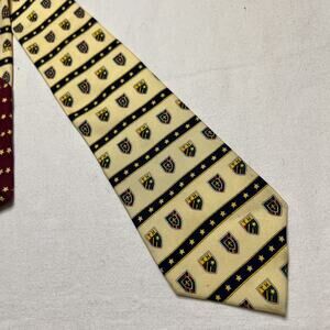 Two tone tie with a fluer di lis crest print on a cream colored base and a star print on maroon. Printed in Italy and made in USA.