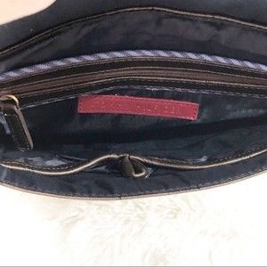 Inside has zipper pocket and 2 slip pockets, trimmed with leather.
