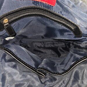 Beautiful Black crossbody purse, with deep spacious interior and a long strap for comfortable crossbody wear. Cloth exterior with logo imprints throughout. Zippered top closure with 1 exterior pocket and 3 interior pockets - one interior pocket is zippered. Don't let the thin design fool you, this bag can hold alot. Very clean. 9"Wx9.5"H