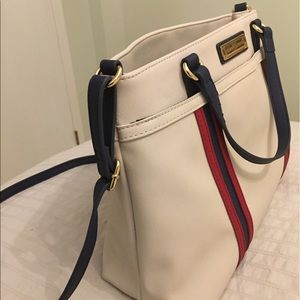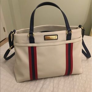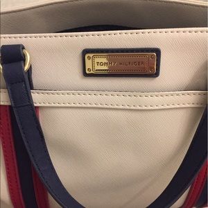 Tommy Crossbody Tote medium size, 2 separate spaces and zipper in the middle, seamless extra pocket in the back... literally new it was a present love it but didn't found the occasion to use it!