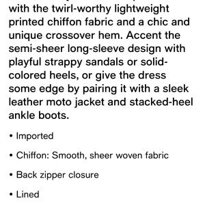 A field of dainty flowers bloom across Tommy Hilfiger's stylish midi dress. Easily make an impression with the twirl-worthy lightweight printed chiffon fabric and a chic and unique crossover hem. Accent the semi-sheer long-sleeve design with playful strappy sandals or solid-colored heels, or give the dress some edge by pairing it with a sleek leather moto jacket and stacked-heel ankle boots.