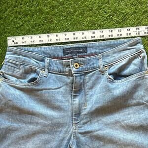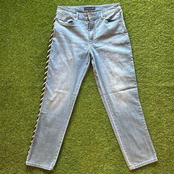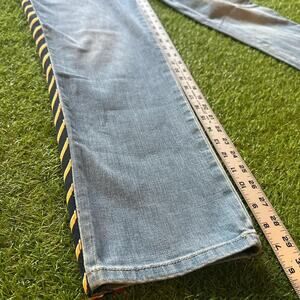 ☆ Features: Light-wash denim with bold yellow and black stripe detailing down the side seams, accented by a red trim. Classic Tommy Hilfiger branding on the waistband and pocket, modern slim fit design, and a statement piece for any casual or streetwear look.