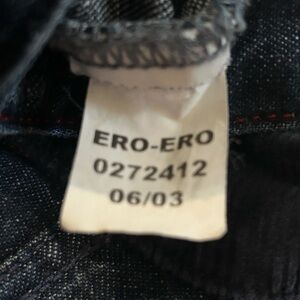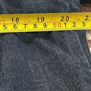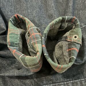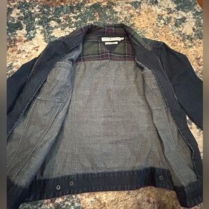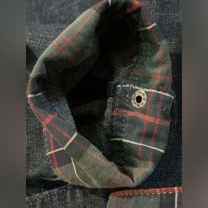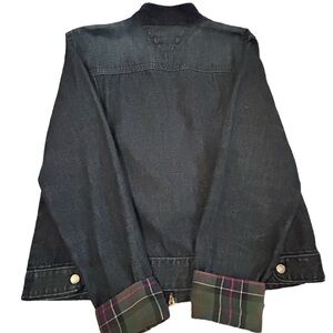 Stylish dark blue jean jacket. Features plaid accents on collar and cuffs. Classic design with front pockets.