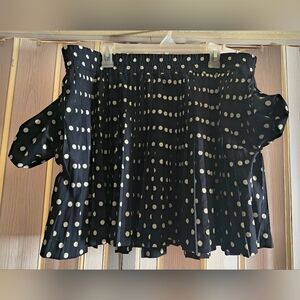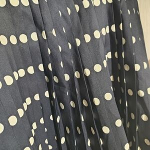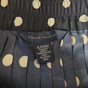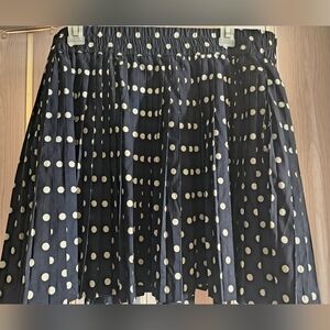 Tommy Hilfiger pleated polka dot skirt size XL dark blue and white! it looks black but its really dark blue i promise. i tried to take up close pictures so you could see but idk if they work or not. i am not sure what kind of material its made out of maybe nylon? im not sure but it's different in my opinion. its light weight and probably feels cool when u wear it. i cannot fit it so i cannot tell you for sure. super cute tho and it has pockets!