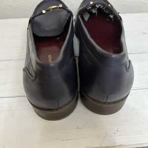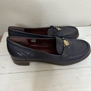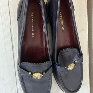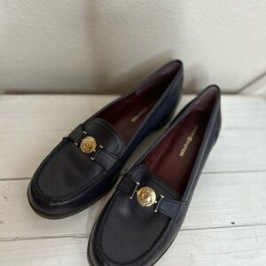 Experience timeless elegance with Tommy Hilfiger's dark navy and gold leather loafers. These flats feature a smooth leather finish with a sophisticated gold-tone detail, perfect for both casual and business casual settings. Great condition outside some peeling on inside as shown in pictures.