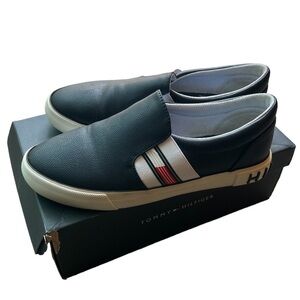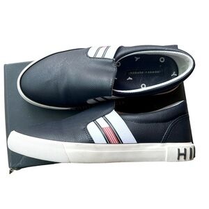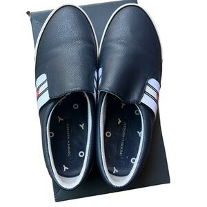 Tommy Hilfiger women’s slide on sneakers shoes size 8.5M. Deep navy color is Hoppin worn, but in good condition comes with box.