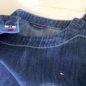 NWOT Tommy Hilfiger Girls Denim Romper with Kangaroo Pocket & Engraved TH buttons- Shoulder closure PTP 18” Length 30” This Dress is New without tags