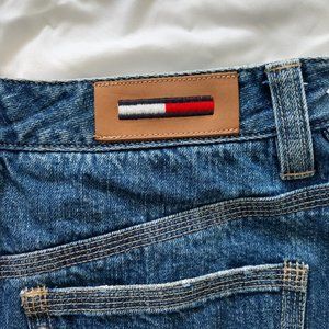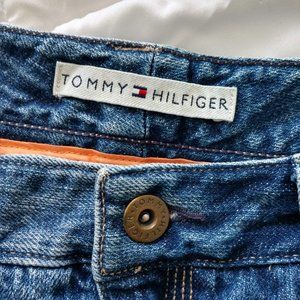 Classic denim mini from Tommy Hilfiger. Cool distressed styling, strap details on side, and small front slits. Tommy logo on back waist. Not quite vintage (from early 2000s). Such a fun piece--perfect for layering in the fall or wearing alone in warmer weather.