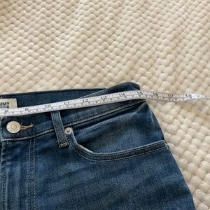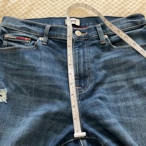 Tommy Hilfiger distressed boyfriend jeans. Dark wash denim with a raw hem.