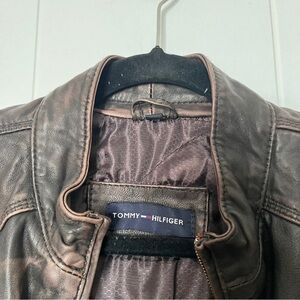 Tommy Hilfiger brown distressed fitted leather moto jacket with zip front and cuffs.