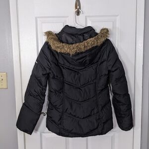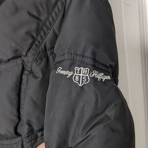 Tommy Hilfiger, Women, Woman, Women's, Size XS, Size Extra Small, Black, Puffy, Puffer, Coat, Warm, Cold Weather, Winter, Fall, Autumn, Autumnal, Down, Outdoors, Outerwear, Feathers, Down Filled, Polyester, Lined, Filled, Acrylic, Faux Fur, Faux Fur Trim, Removable Hood, Hooded, Winter Coat, Holidays, Pockets, Full Zip, Designer, Zip-Up, Logo, Embroidered Logo, TH, RN 77806