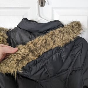 In great condition! The hood is removable and has a faux fur trim.