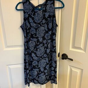 Elegant sleeveless dress with a floral pattern. Features a black base with blue floral designs. Has some elasticine for a stretchy comfortable fit. Size 10.