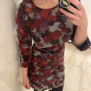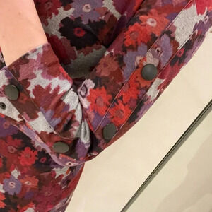 Floral print dress with modern black button accents along the sleeves. Zipper closure at back. Poly rayon spandex. 17.5” at bust. 36” long. Some wear including occasional peeling and wear to buttons reflected in deeply discounted price. Still wears beautifully!