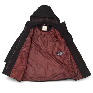 Materials (from tag): Shell wool blend (65% wool, 25% polyester, 5% other fibers); Hood lining is a wool-blend; Body lining 100% polyester
