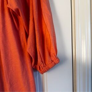 This relaxed dress from Tommy Hilfiger features a vibrant orange hue with elegant cream embellishments around the neckline. The 3/4 length puff sleeves add a touch of sophistication, making it perfect for both casual and semi-formal occasions. Its flowing silhouette ensures comfort and style throughout the day.