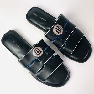 Tommy Hilfiger slide sandals in excellent condition. Faux black leather straps, blue and white piping, TH chrome logo.