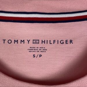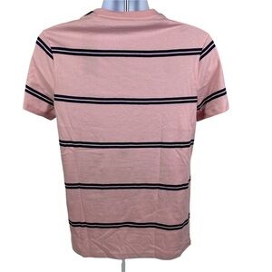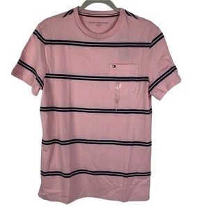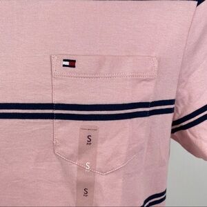 New Fall '21 Tommy Hilfiger Men's Small Light Pink Navy Blue Striped Short Sleeve T-Shirt. Embroidered Flag on Chest Pocket. Smoke free home. Brand New Condition.