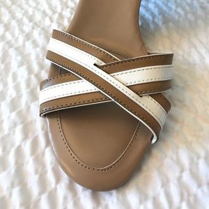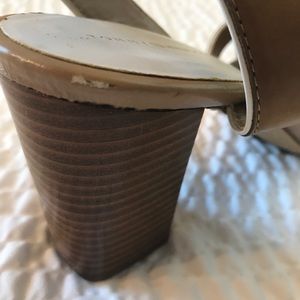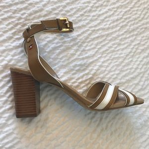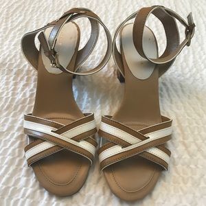 Great condition - Worn once inside ~ Tan and white Ankle strap with adjustable buckle ~ Cushioned toe ~ Approx heel 3.5" ~ See pic of small scuff on heel of right shoe