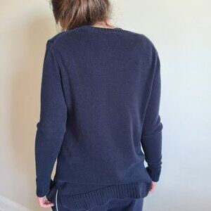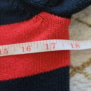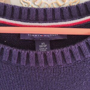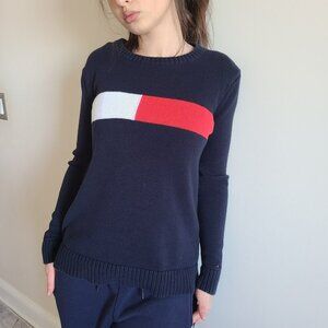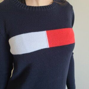 Classic Tommy Hilfiger navy sweater featuring the iconic red, white, and blue flag stripe across the chest.